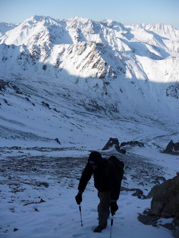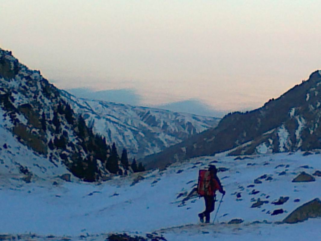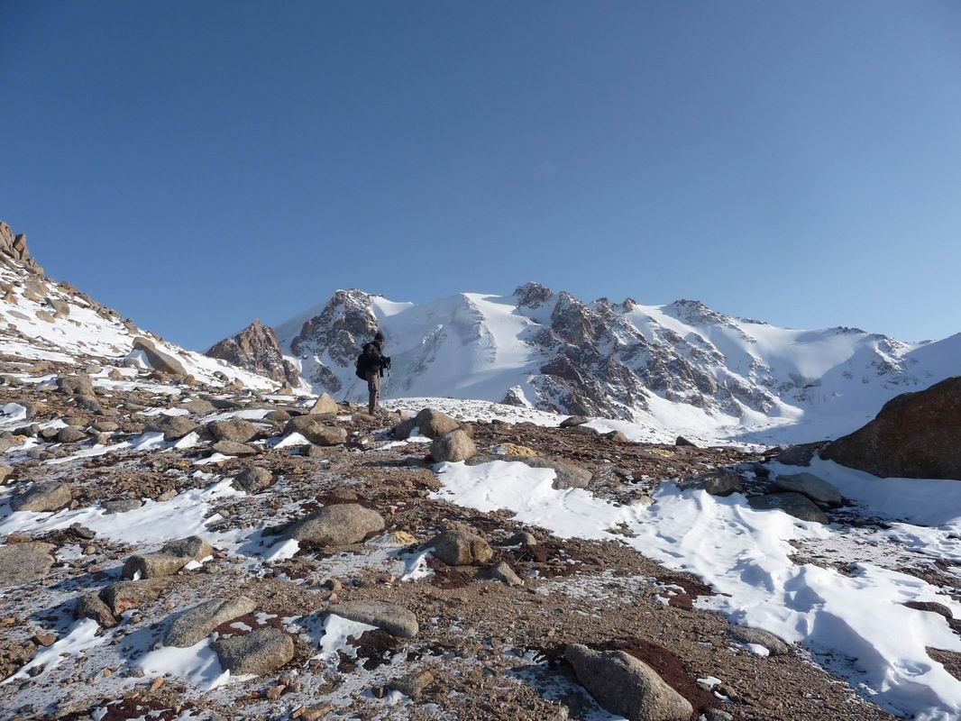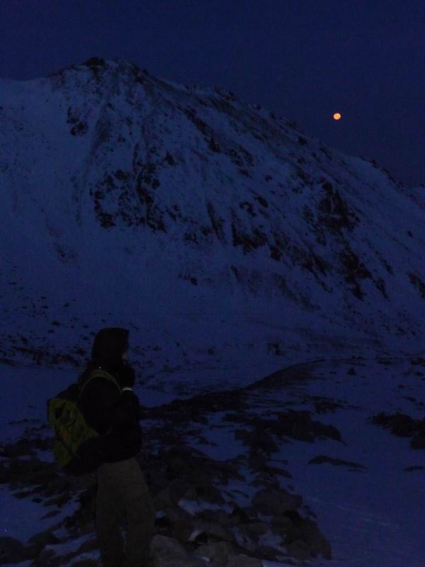 Солнце еще не взошло, но полная луна уже рыжая, она за спиной и освещает путь. На светлеющем небе еще горят звезды, со всех сторон молча смотрят горные исполины, где-то рядом, может быть, спит снежный барс, они здесь водятся. В общем, ощущения совершенно мистические.