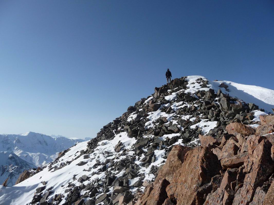 В общем, первого жандарма я кое-как прошел, а дальше мне стало страшно. Я подумал, что даже если я сейчас пройду второго жандарма и дойду до вершины, то на обратном пути, уже уставший, я должен буду опять их пройти, и тут уже шансы мои будут совсем мизерными. Миша показывает мне безопасный путь по склону и уходит на вершину один, а я спускаюсь вниз.