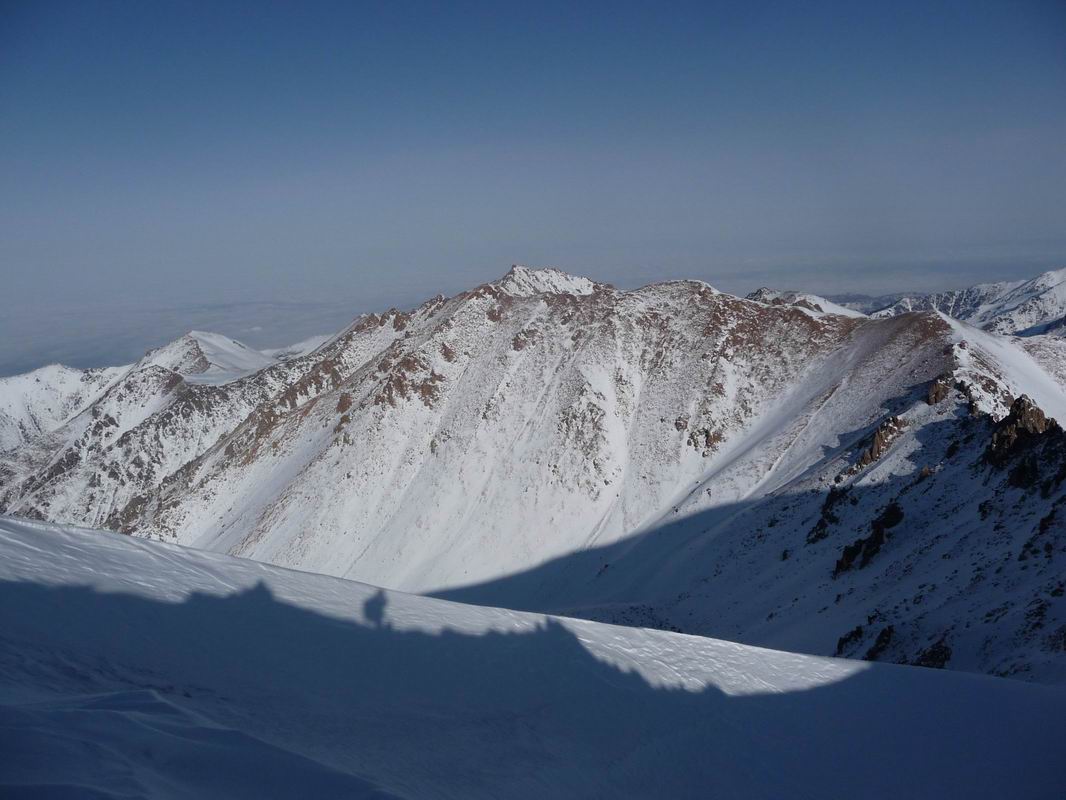 А вот мой любимый Большой Алматинской пик! Прошедшей осенью я пробовал подняться на него. И еще раз, уже в одиночку, пытался, здесь, кстати, видно, как он выглядит из города, а также с обратной стороны. А вот как смешно он выглядит сбоку — как гармошка: