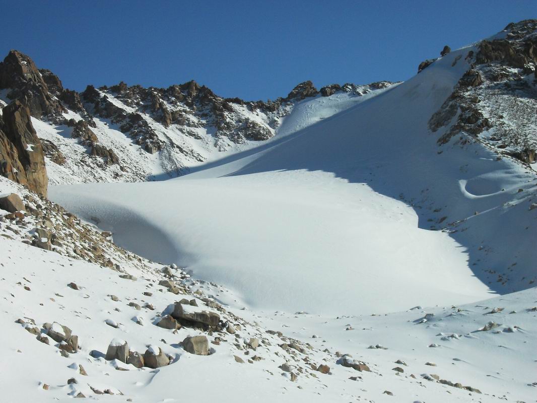 Но предвершину-то я взял! Мой первый в жизни самый настоящий четырехтысячник — 4050 метров! Да и внизу тут тоже неплохо, скажу я вам: тепло и сыро! :-))) И не без достопримечательностей. Вот, к примеру, красавец ледник Локомотив!