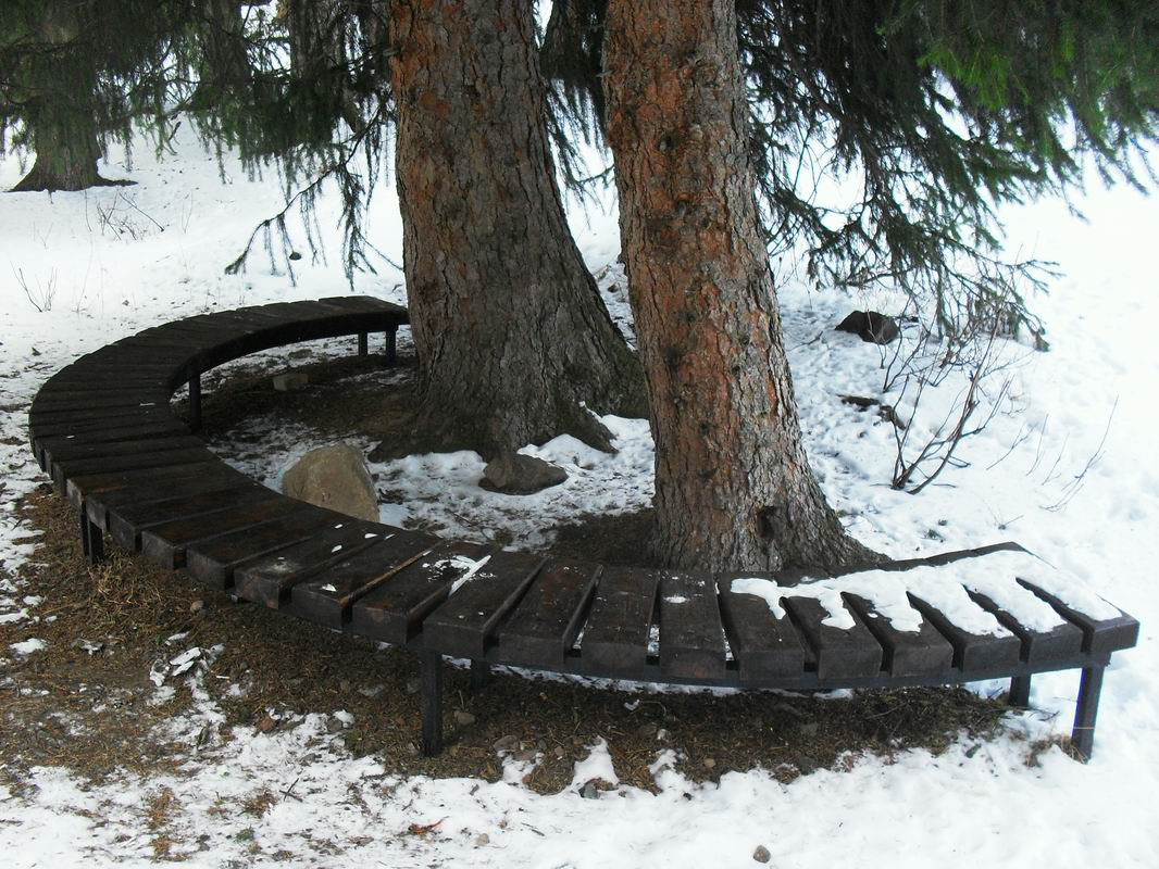 Сюда приходят помянуть своих родных и близких круглый год, погода в горах очень переменчива, поэтому создатели мемориала соорудили необходимые и достаточные лавочки: деревянные, чтобы не мерзнуть; полукругом под кроной елей, чтобы было сухо, когда дождь или снег; коричневой гаммы, чтобы в тон.