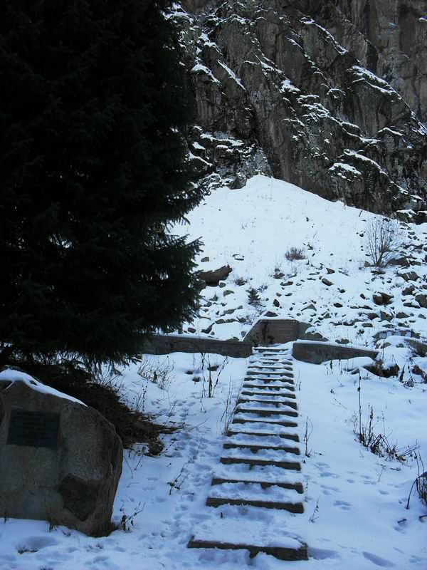 Время есть и по пути я решаю зайти на мемориал погибшим альпинистам, кажется, так он раньше назывался. С дороги его почти не видно и если не знать, что он где-то здесь, то запросто можно пройти мимо. Вон там, между деревьями, видны ступеньки.