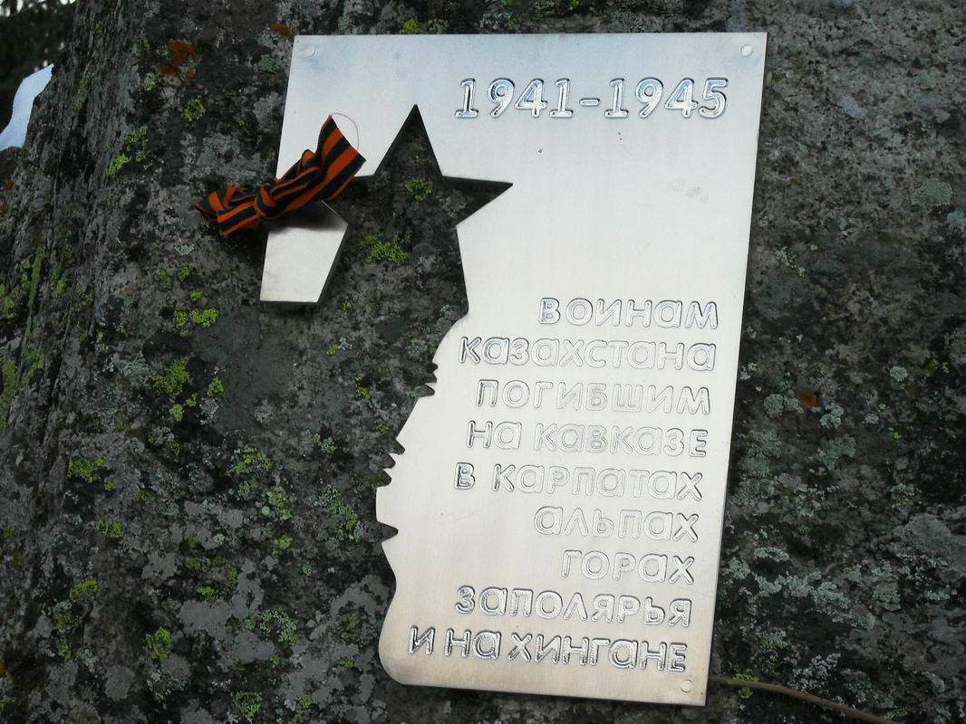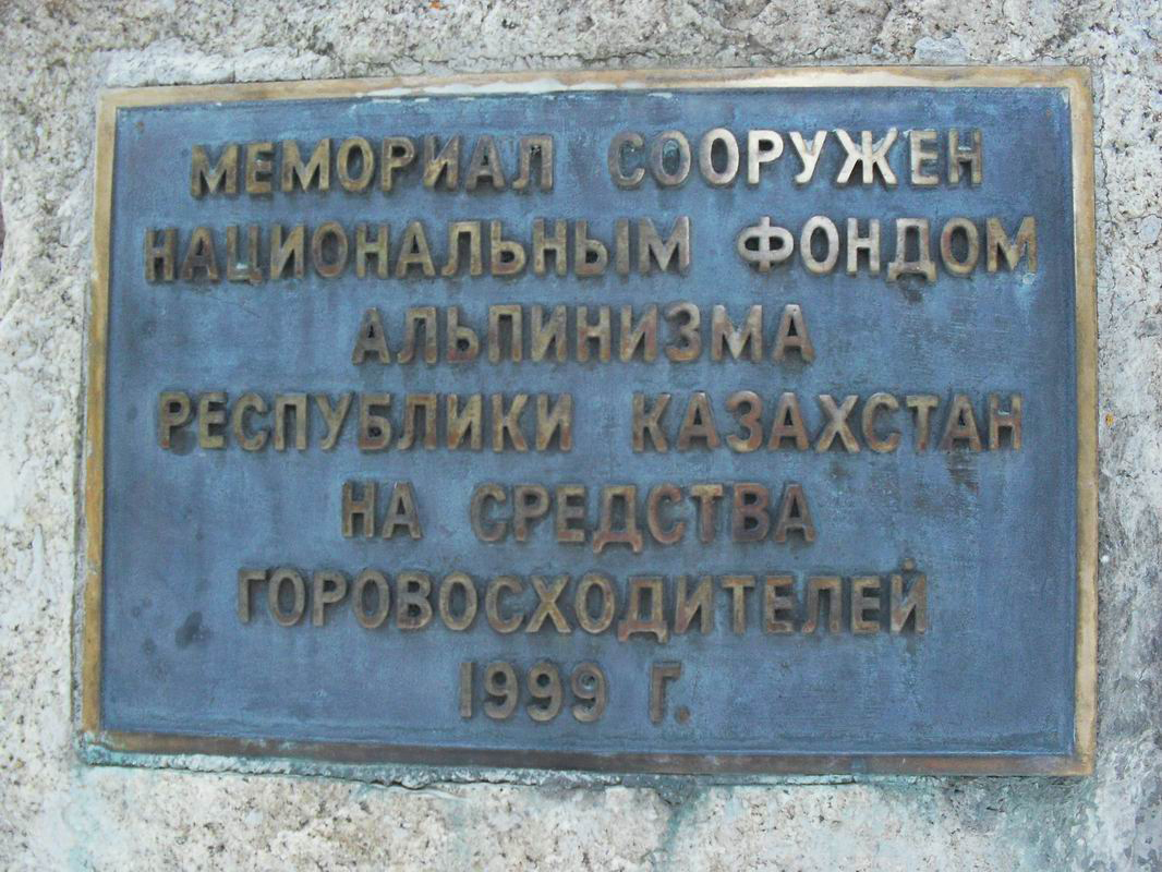 На барельефной плите из красного гранита — выполненные из чугуна ледоруб с веревкой; три цветка эдельвейса, символа мужества, силы и красоты; и надпись на казахском и русском языках.