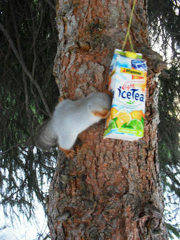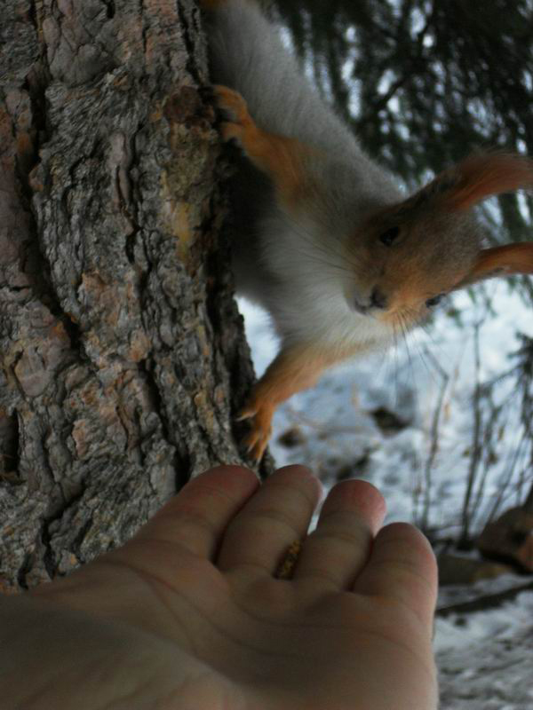 На елях вокруг мемориала живут ручные белки. Одну из них я попытался покормить сухой веточкой (опыт есть: смотри, например, мой отчет про Прагу).