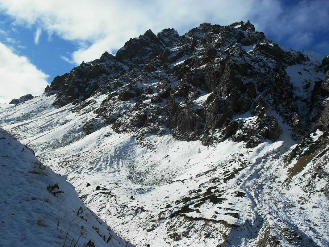 Я дошел до верхней плотины, называется: «Мынжылки», высота 3100 метров над уровнем моря. Чуть ниже центра фотографии, прямо под плотиной, видны домики одноименной метеорологической станции. Кроме этой в Алматы есть еще 4. Данные со станций в реальном времени поступают в центр Алматыметео, где обрабатываются и служат исходным материалом для формирования прогнозов погоды. Фактическую погоду прямо сейчас с этих станций можно посмотреть на странице Алматыметео. На станции Мынжылки множество хитрых дивайсов, черный кот, биллиардный стол и много другой прикольной всячины. Виртуально заглянуть туда и познакомиться с суровыми метеорологами можно благодаря статье на Vox Populi. А я сейчас поднимусь на эту плотинку и сразу направо, на склон.