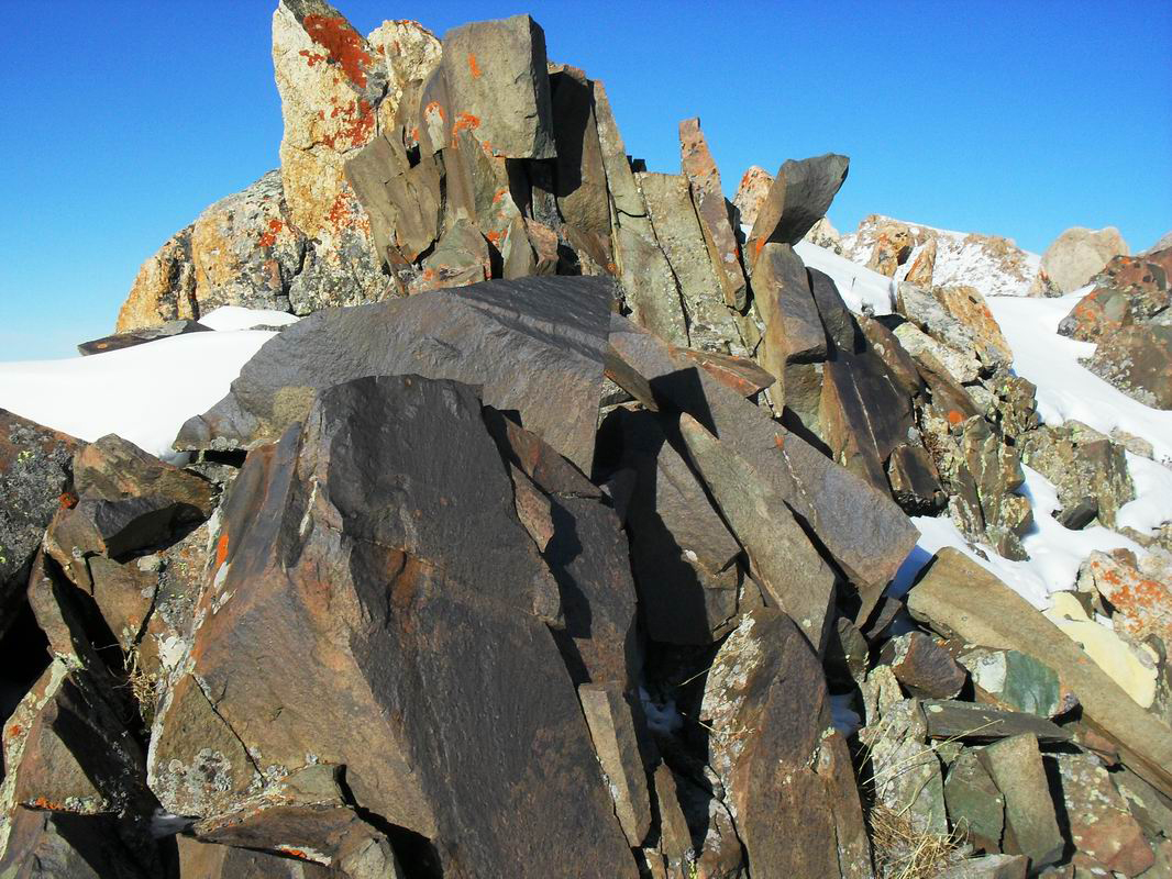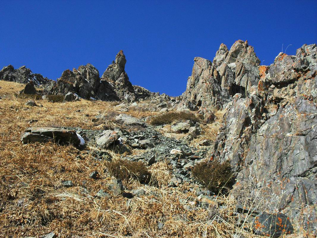 Вот, что значит юго-восточный склон — снега вообще нету! Есть только странного вида скалы. На всякий случай через каждые 10 шагов верчу головой и постоянно прислушиваюсь, и вообще стараюсь держаться от них на расстоянии — не известно, чего от них можно ожидать :-)